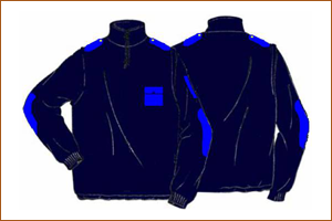 Pile antifreddo con cerniera al petto Realizzato in tessuto pile 100% filo maglia poliestere peso 270 di colore blu notte (oppure grigio-verde scuro - colore indicativo tipo 58018 variante 200 - per esigenze operative della Polizia Provinciale) è composto da un dietro e un davanti, maniche a giro e terminanti con polso chiuso da elastico e collo rettangolare in doppio tessuto chiuso da una cerniera applicata a filo e lunga cm. 22 circa. Il capo è attrezzato con spalloni, controspalline, passante porta fischietto, taschino porta placca, toppe su maniche e taschino portapenne come previsto per maglione tipo"V". Sul petto sinistro vi sono tre pezzi di velcro: quello superiore per il grado ricamato, quello intermedio per l'etichetta "POLIZIA LOCALE", quello inferiore per eventuale altro stemma. Sotto le tre strisce si posiziona taschino porta placca. Il fondo del capo presenta una coulisse o un elastico. (Nell'immagine le toppe, i taschini e le controspalline sono segnati in colore azzurro per esigenze di chiarezza, ma nella realizzazione del capo sono di colore blu notte). |