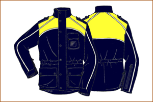 Combinazione motociclista invernale - Giaccone Realizzato con tessuto impermeabile e traspirante di colore blu notte è composto da un dietro e due davanti e maniche a giro terminanti con orlo. Internamente al fondo della manica è inserita una manichetta in tessuto impermeabile con orlino elasticizzato. Sul fondo della manica è posizionata una fettuccia con bottone automatico che permette l'ancoraggio del corpetto interno. Sul fondo di entrambe le maniche vi sono due alloggiamenti chiusi da cerniera coperta da doppio filetto per l'alloggiamento dei manicotti rifrangenti grigio-argento (alti minimo cm 25). Per una maggiore vestibilità nel fondo della manica è inserita un'apertura protetta da soffietto e chiusa da cerniera coperta da doppio filetto. La chiusura del fondo manica avviene tramite alamaro regolabile con velcro. Nel davanti e nel dietro delle maniche è presente una filettatura rifrangente (coda di topo) grigio-argento. Tale filettatura rifrangente si raccorda con analoga posta all'altezza delle spalle, sia sul davanti che sul dietro del corpo. Sulle spalle vi sono controspalline di colore blu notte, per tubolari portagradi, inserite distalmente nella cucitura della spalla, fermate all'estremità prossimale con bottone automatico a pressione ricoperto da gomma antigraffio dello stesso colore del tessuto. In vita si trova una coulisse con uscita sotto le due battute anteriori, bloccata da fermacordone e con campanella coprinodo. La giacca è foderata con tessuto a rete. Tra il tessuto esterno e la fodera è presente una membrana impermeabile e traspirante. Sul davanti all'altezza del petto c'è una filettatura rifrangente (coda di topo) grigio-argento che si raccorda con un simile posto sul dietro del corpo, sotto la scritta "POLIZIA LOCALE". Le parti di tessuto poste sopra a questi ultimi due filetti rifrangenti sono di colore giallo ad alta visibilità, escluse le controspalline che sono di colore blu notte. Anteriormente la giacca ha la chiusura centrale con cerniera dal collo fino a circa cm 5/10 dal fondo. Tale cerniera è coperta da due battute in tessuto, la battuta di sinistra è fermata su quella di destra da sette bottoni automatici a pressione ricoperti da gomma antigraffio dello stesso colore del tessuto. Il collo è rettangolare con inserto anallergico confortevole, salvabarba con all'interno lo stesso tessuto anallergico, superiormente si trova un bordino morbido. Sui fianchi vi sono due tasche, una destra e una sinistra, verticali, chiuse da cerniera e coperte da patta con tessuto a strappo tipo maschio/femmina. Su queste due tasche vi sono due tasche più piccole, una per tasca, portapenne e/o accessori. Sotto la battuta sinistra c'è un taschino portadocumenti, con apertura verticale chiusa con cerniera. Sul davanti destro, all'altezza del petto, c'è una tasca con apertura verticale chiusa da cerniera e coperta da una patta fermata con materiale a strappo tipo maschio/femmina. Sul davanti sinistro, all'altezza del petto, si trova una tasca applicata chiusa da cerniera e coperta da un a patta fermata con materiale a strappo tipo maschio/femmina. Sopra questa tasca è applicato un taschino porta-cellulare con inserto in rete per facilitare l'ascolto della suoneria. Nel fondo del corpo (parte interna) è presente un'apertura, chiusa da cerniera, per poter estrarre le protezioni. Ivi è presente apposita caditoia per vapore ricoperta da retina. Le tasche porta protezioni, chiuse da tessuto a strappo tipo maschio/femmina, sono previste sui gomiti e nella parte centrale della schiena. Sulle spalle vi sono ancoraggi a mezzo tessuto a strappo tipo maschio/femmina per la regolazione della posizione delle protezioni. L'interno è staccabile, trapuntato a rombo, non portabile, imbottito in ovatta con alluminio, maniche a giro terminanti con orlo. Al fondo manica è presente un bottone a pressione per l'ancoraggio alle maniche della giacca. Chiusura anteriore centrale con cerniera che permette l'ancoraggio alla giacca. Sul fondo, internamente, è prevista una striscia di tessuto antitrascinamento. Le protezioni delle spalle e dei gomiti-avambracci sono amovibili e morbide, conformi a EN 1621-1/96. La protezione della schiena è amovibile, di tipo semirigida/morbida, conformi a UNI EN 1621-2/2004 Sulla schiena, nella parte alta, è presente la scritta su due livelli "POLIZIA LOCALE" in materiale rifrangente grigio-argento, stampato a caldo. Sul taschino superiore sinistro vi sono due inserti in velcro: il primo per la striscia amovibile "POLIZIA LOCALE", di tipo rifrangente; il secondo per l'applicazione di stemmi di specialità. Sulla manica sinistra a cm 15 circa dalla base della controspallina deve essere applicato lo stemma regionale nella versione ricamata, un altro inserto in velcro è posizionato sulla manica destra all'altezza dello stemma regionale per l'applicazione del distintivo ricamato di reparto.