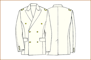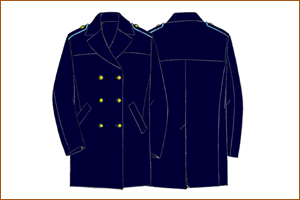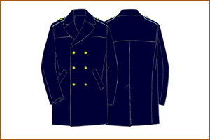 Soprabito impermeabile/traspirante (Commissari) - (personale maschile) In tessuto impermeabile e traspirante di colore blu notte con corpetto staccabile. Il soprabito a doppiopetto a tre più tre bottoni grandi in metallo dorato di tipo regionale ha una lamina interna impermeabile e traspirante; internamente il capo è foderato, di vestibilità ampia e lunghezza al ginocchio. L'impermeabile si compone delle seguenti parti: - corpo; - collo con listino; - carrè; - maniche; - controspalline; - cintura; - fodere; - corpetto staccabile. Il corpo è composto da quattro parti, due anteriori e due posteriori, che formano il davanti ed il dietro del capo. Le parti anteriori (davanti) sono rifinite da una mostra dello stesso tessuto impermeabile applicata interamente, dalla spalla al fondo al quale è cucita, previa ripiegatura interna di cm 13,5 circa. La mostra, di ampiezza appropriata e di lunghezza variabile a seconda della taglia, termina al fondo con una larghezza di cm 13,5 circa. I due davanti, dalle spalle al fondo, sono rinforzati internamente da un tratto di fliselina termoadesiva. Internamente, sulla mostra sinistra è ricavata una tasca a taglio obliquo, apertura cm 14, rifinita con doppia filettatura ciascuna alta cm 0,7. La fodera interna della tasca e la doppia filettatura sono realizzate con lo stesso tessuto della fodera del soprabito. Sul bordo libero di ciascuna mostra, nella parte interna, è applicata una striscia dello stesso tessuto dell'impermeabile, alta cm 4 circa, internamente rinforzata con tela termoadesiva bianca. Su detto bordo è applicata una semicerniera a catena aperta che, fissata anche alla lunetta girocollo, corre da una parte all'altra del davanti, facendo riscontro alla semicerniera ad essa complementare, posta sulla termofodera. Le due mostre sono collegate superiormente ad una lunetta girocollo alta al centro cm 3 circa e costituita da due pezzi sovrapposti dello stesso tessuto esterno dell'impermeabile, ognuno dei quali è rinforzato, con flisellina (sopra) e tela termoadesiva (sotto). Il lembo superiore della lunetta è inserito nella stessa cucitura di fermo del listino del collo. Le parti superiori dei davanti, opportunamente ripiegate formano i risvolti, rinforzati internamente da un pezzo di tela termoadesiva. Sui due risvolti, a cm 2,5 circa dal bordo superiore ad a cm 2 circa da quello laterale, c'è un'asola orizzontale a goccia lunga cm 2,5 circa. In corrispondenza di dette asole è applicato sia sulla parte anteriore destra che anteriore sinistra un bottone per la chiusura dei baveri al collo. Questi bottoni sono in resina a quattro fori e di colore in tono con il tessuto. Sulla parte anteriore di sinistra, a cm 2 circa dal bordo libero e a una distanza che varia a seconda della taglia, vi sono tre asole orizzontali a goccia, lunghe cm 2,5 circa. A lato di ciascuna di esse e sulla stessa linea, a cm 13 circa dal bordo del davanti, è applicato un bottone dorato grande di modello regionale. Il primo di questi bottoni, quello superiore, è collegato internamente con un controbottone in resina a quattro fori di colore in tono conil tessuto. Sulla parte anteriore destra, in corrispondenza con le asole vi sono tre bottoni dorati grandi di modello regionale, alla distanza di cm 13 circa dal bordo libero. All'altezza del primo bottone (superiore), a cm 2 circa dal bordo del davanti destro si trova un'asola orizzontale per l'abbottonatura del controbottone interno della parte anteriore sinistra. Su ogni davanti si trova una tasca con apertura obliqua, con fintino rettangolare (cm 4,5 x 19,5) realizzato con un pezzo dello stesso tessuto del corpo, ripiegato su se stesso e rinforzato internamente con un tratto di flisellina. Il fintino è fissato sul davanti da due cuciture parallele lungo i lati corti e da una cucitura lungo il lato lungo inferiore; il lato libero è rifinito da una cucitura realizzata in prosecuzione di quella interna dei lati corti a cm 0,7 circa da bordo. La tasca è foderata con tela di cotone silesias. Nella tasca sinistra vi deve essere un'apertura che permetta la fuoriuscita delle nappe della sciarpa azzurra, e quando non utilizzata viene chiusa con cerniera. Le parti anteriori e quelle posteriori, dietro, sono cucite tra loro lungo i fianchi e in modo da unire alle spalle le due parti anteriori con il carrè posteriore, al cui lembo inferiore sono cucite le parti posteriori. Lungo tale cucitura di unione ai fianchi, all'altezza della vita, è applicato un passante, largo cm 1 circa e con luce di cm 5 circa, realizzato con lo stesso tessuto del corpo. I due davanti sono rifiniti lungo i bordi liberi con una cucitura a cm 0,7 circa dal bordo e terminano al fondo con un ripiego interno di cm 5 circa rinforzato internamente con tessuto termoadesivo. I dietro sono cuciti ai due davanti lungo i fianchi e al lembo inferiore del carrè posteriore, che superiormente si unisce ai due davanti e al bavero. Le due parti posteriori sono cucite tra loro con cucitura ribattuta, che inizia dal carrè e termina allo spacco inferiore, di lunghezza cm 45 circa. Questo spacco è fermato all'apertura con una travettatura obliqua lunga cm 4,5 circa. Il lembo sinistro ha un ripiego interno largo cm 6 circa, internamente rinforzato con tessuto adesivo, il lembo destro è rifinito da una cucitura realizzata al bordo. I due dietro terminano al fondo con un ripiego interno di cm 4 circa, rinforzato internamente con flisellina termoadesiva. Il bavero si compone di un soprabavero e di un sottobavero, con lunetta a girocollo, realizzato con lo stesso tessuto del corpo. Il soprabavero è rinforzato con flisellina termoadesiva, il sottobavero e la lunetta esterna sono rinforzati con tela termoadesiva. Tali elementi sono cuciti tra loro e sono rifiniti, lungo i bordi liberi, con una cucitura realizzata a cm 0,7 circa dai bordi. Nella parte superiore il soprabito presenta un carrè, realizzato con tre pezzi di tessuto, due anteriori sovrapposti ai davanti ed un