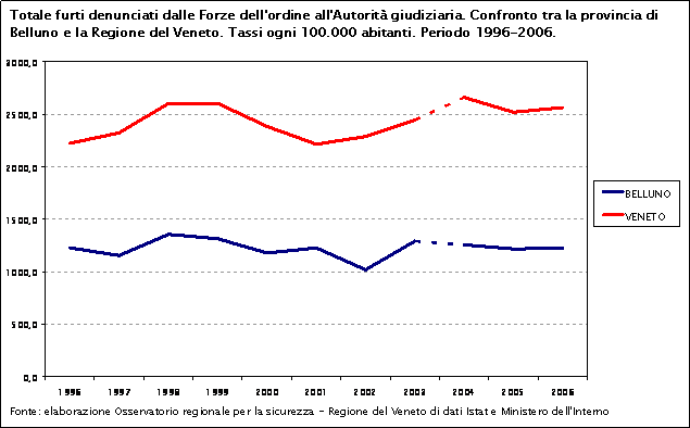 Confrontando il tasso dei furti totali denunciati nelle province venete nel 2006, la provincia di Belluno ha il tasso più basso.