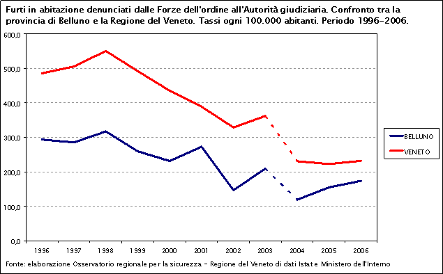 Nel 2006 il tasso dei furti in abitazione nella provincia di Belluno è pari a 173,8 casi denunciati ogni 100.000 abitanti, inferiore alla media regionale (230). Rispetto al 2004, il dato è in aumento nella provincia, costante a livello regionale.