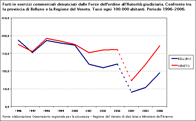Nel decennio 1996-2006 i furti in esercizi commerciali nella provincia di Belluno e in Veneto presentano un andamento pressoché identico. I primi anni sono caratterizzati da una tendenziale stabilità, a cui fa seguito un netto decremento nel 2003 ed un altrettanto significativo aumento dal 2004. La diminuzione è spiegabile con il passaggio al sistema di rilevazione S.D.I.