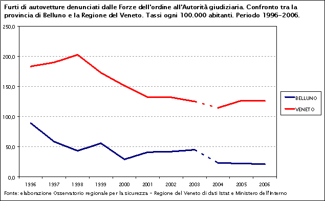 Dal 1996 ad oggi i furti di autovetture denunciati sono in diminuzione sia nella provincia di Belluno sia in Veneto, con una decrescita più marcata a livello regionale. In tutto il periodo considerato il dato provinciale è molto inferiore a quello regionale.