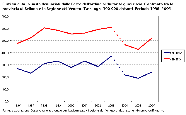 Nel decennio 1996-2006 i furti su auto in sosta nella provincia di Belluno e in Veneto presentano un andamento molto simile: ad una fase iniziale di sostanziale stabilità (1996-2003) segue una decrescita (2004-2005) ed una nuova ripresa nel 2006. In tutto il periodo considerato la curva del Veneto si trova al di sopra di quella provinciale.