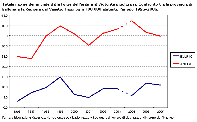 Osservando le curve delle rapine totali nella provincia di Belluno e in Veneto nel decennio 1996-2006 si può notare un andamento simile fino al 2003 e direzioni opposte negli ultimi anni. Fino al 1999 entrambe le zone sono caratterizzate da una crescita dei tassi, a cui segue una leggera diminuzione e una nuova ripresa dal 2001 al 2003. Dal 2004, invece, nella provincia il tasso aumenta, mentre in Veneto diminuisce del 17,7%. In tutto il periodo considerato la curva del Veneto si trova al di sopra di quella provinciale.