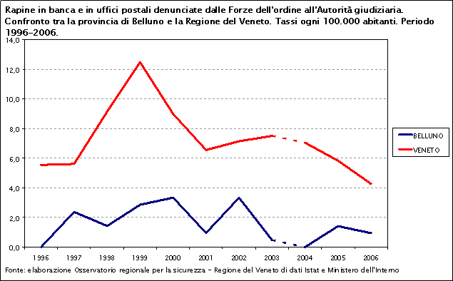 Nel decennio 1996-2006 il tasso di rapine in banca e in uffici postali nella provincia di Belluno ha un andamento più altalenante rispetto a quello regionale, anche se le oscillazioni sono meno ampie. Il tasso provinciale è inferiore a quello regionale in tutto il periodo considerato.
