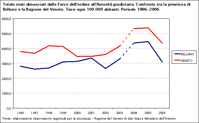 Nel periodo 1996-2006 i tassi di criminalità totale nella provincia di Belluno e nella Regione del Veneto seguono un andamento molto simile, con quelli provinciali sempre leggermente inferiori a quelli regionali.