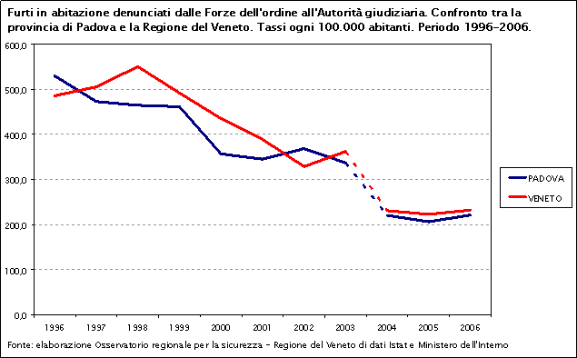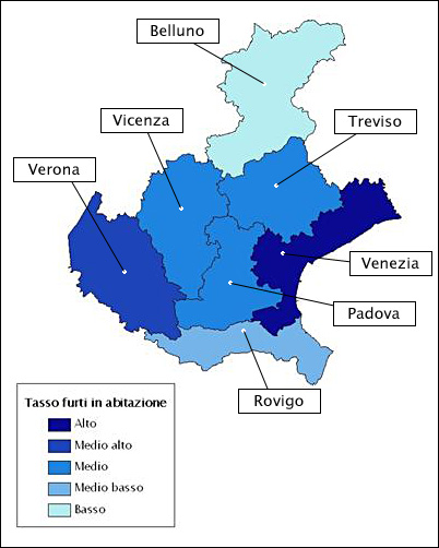 Confrontando il tasso di furti in abitazione denunciati nelle province venete nel 2006, la provincia di Padova, insieme a quelle di Treviso e Vicenza, ha un tasso medio.