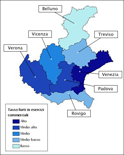 Confrontando il tasso di furti in esercizi commerciali denunciati nelle province venete nel 2006, la provincia di Padova, insieme a quella di Verona, ha un tasso medio alto.