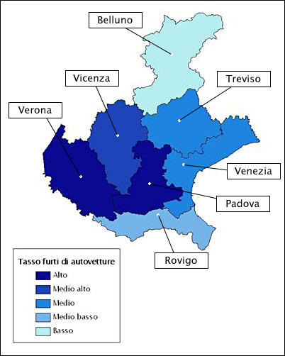 Confrontando il tasso di furti su auto in sosta denunciati nelle province venete nel 2006, la provincia di Padova, insieme a quella di Venezia, ha un tasso medio alto.