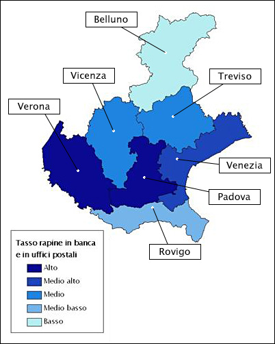 Confrontando il tasso di rapine in banca e in uffici postali denunciate nelle province venete nel 2006, la provincia di Padova, insieme a quella di Verona, ha il tasso più elevato.