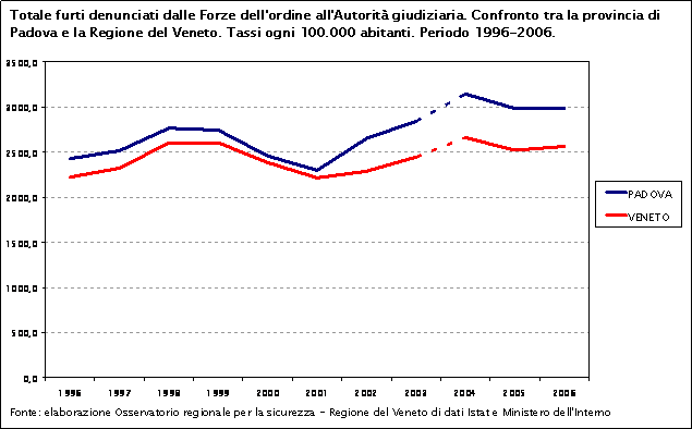 Confrontando il tasso dei furti totali denunciati nelle province venete nel 2006, la provincia di Padova, insieme a quella di Verona, ha un tasso medio alto.