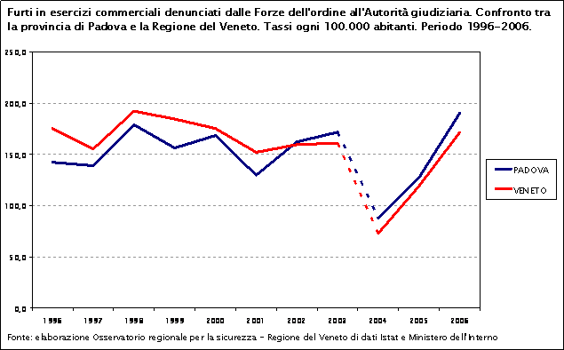 Nel decennio 1996-2006 i furti in esercizi commerciali nella provincia di Padova e in Veneto presentano un andamento molto simile. I primi anni sono caratterizzati da una tendenziale stabilità, a cui fa seguito un netto decremento nel 2004 ed un altrettanto significativo aumento nel 2005 e 2006. La diminuzione è spiegabile con il passaggio al sistema di rilevazione S.D.I.