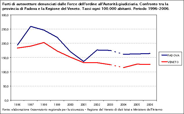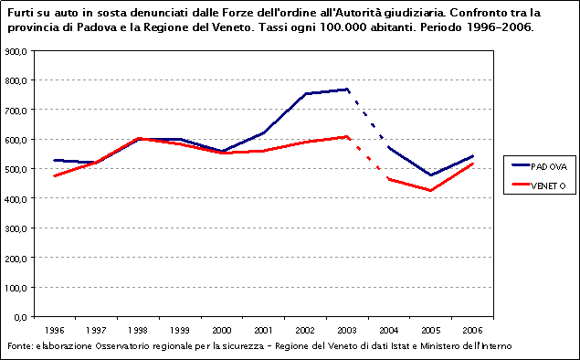 Nel decennio 1996-2006 i furti su auto in sosta nella provincia di Padova e in Veneto presentano un andamento molto simile: ad una fase iniziale di sostanziale stabilità segue una crescita che raggiunge il suo picco massimo nel 2003. Dal 2003 il tasso scende in modo marcato, per risalire dal 2005.