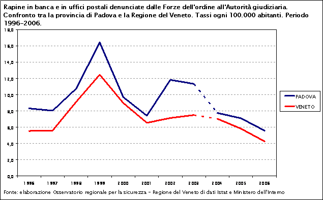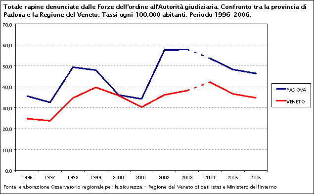 Osservando le curve delle rapine totali nella provincia di Padova e in Veneto nel decennio 1996-2006 si può notare un andamento abbastanza simile. Nel primo periodo entrambe le zone sono caratterizzate da una crescita dei tassi, a cui fa seguito una diminuzione e, dal 2001, una nuova ripresa. Negli ultimi anni i tassi tornano a calare.