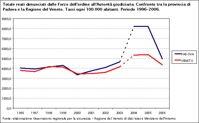 In particolare, dal 2003 al 2005 si registra una crescita del tasso di reati totali da 4.157,8 a 5.379,9 ogni 100.000 abitanti in Veneto e da 4.654,1 a 8.207,4 ogni 100.000 abitanti nella provincia. Questo aumento è con tutta probabilità dovuto, almeno in parte, al passaggio al sistema di rilevazione S.D.I.