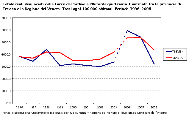 In particolare, dal 2003 al 2005 si registra una crescita del tasso di reati totali: da 4.157,8 a 5.379,9 ogni 100.000 abitanti in Veneto e da 3.347,3 a 5.408 ogni 100.000 abitanti nella provincia. Questo aumento è con tutta probabilità dovuto, almeno in parte, al passaggio al sistema di rilevazione S.D.I.