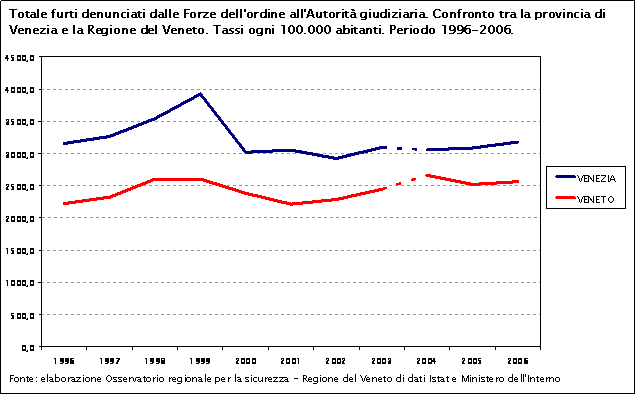 Confrontando il tasso dei furti totali denunciati nelle province venete nel 2006, la provincia di Venezia ha il tasso più elevato.