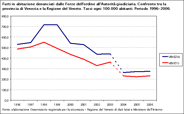 Nel 2006 il tasso dei furti in abitazione nella provincia di Venezia è pari a 273,8 casi denunciati ogni 100.000 abitanti, superiore alla media regionale (230). Rispetto al 2004, il dato è costante sia a livello provinciale sia a livello regionale.