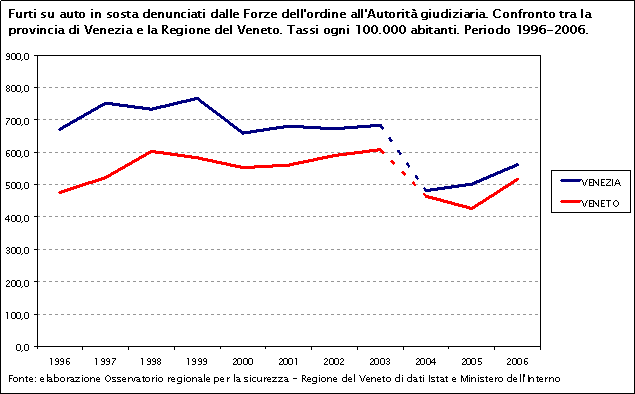 Nel decennio 1996-2006 i furti su auto in sosta nella provincia di Venezia e in Veneto presentano un andamento molto simile: ad una fase iniziale di sostanziale stabilità (1996-2003) fa seguito una decrescita ed, infine, una nuova ripresa nel 2005. In tutto il periodo considerato la curva del Veneto si trova al di sotto di quella provinciale.