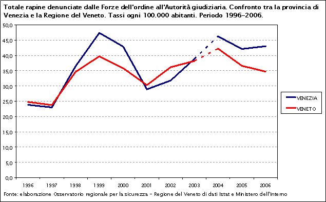 Osservando le curve delle rapine totali nella provincia di Venezia e in Veneto nel decennio 1996-2006 si può notare un andamento simile in tutto il periodo considerato. Fino al 1999 entrambe le zone sono caratterizzate da una crescita dei tassi, a cui fa seguito una diminuzione. Dal 2001 si registra una ripresa, seguita, negli ultimi anni, da una nuova decrescita.