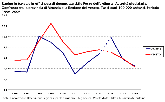 Nel decennio 1996-2006 il tasso di rapine in banca e in uffici postali nella provincia di Venezia ha un andamento oscillatorio molto simile a quello del Veneto. Il tasso provinciale raggiunge il suo picco massimo nel 1998, quello regionale nel 1999.