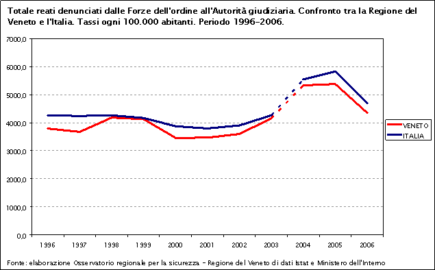 In particolare, dal 2003 al 2005 si registra una crescita del tasso di reati totali: da 4.265,1 a 5.837,3 ogni 100.000 abitanti in Italia e da 4.157,8 a 5.379,9 ogni 100.000 abitanti in Veneto. Questo aumento è con tutta probabilità dovuto, almeno in parte, al passaggio al sistema di rilevazione S.D.I.