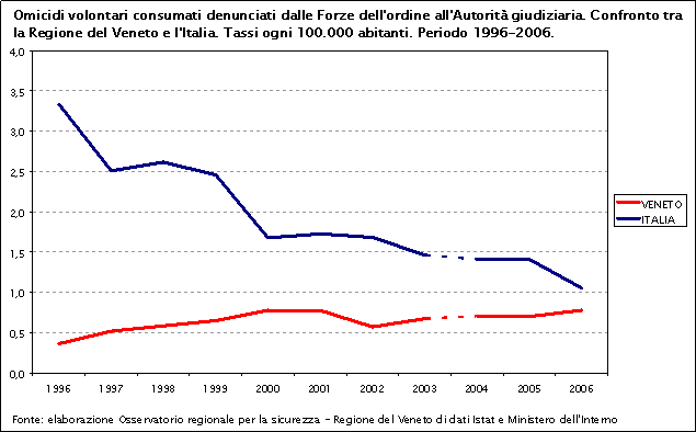 Osservando gli omicidi volontari denunciati dalle Forze dell’ordine all’Autorità giudiziaria dal 1996 a oggi si possono notare andamenti opposti per Veneto e Italia. Ad una decrescita del tasso nella penisola corrisponde, infatti, una leggera ma progressiva crescita in Veneto. La riduzione italiana dipende, in gran parte, dalla diminuzione degli omicidi di tipo mafioso nelle regioni meridionali e nelle isole. La minore presenza di criminalità organizzata al Nord contribuisce quindi a spiegare il diverso andamento dei tassi nelle due zone in esame ed i valori più bassi registrati in Veneto.