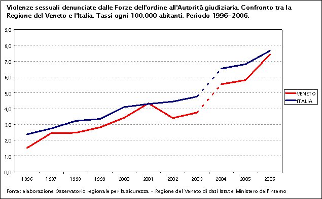 Nel 2006 il tasso di violenze sessuali nella Regione del Veneto è pari a 7,4 casi denunciati ogni 100.000 abitanti, leggermente inferiore alla media nazionale (7,7). Il tasso è in aumento, dal 2004 al 2006, sia in Veneto sia in Italia.