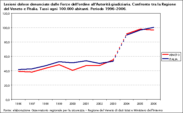 Dal 1996 ad oggi il tasso di lesioni dolose denunciate è simile nelle due aree. Sia in Veneto sia in Italia il tasso rimane tendenzialmente costante sino al 2003 ed aumenta dal 2004. Questa crescita è imputabile, in buona misura, al passaggio dal vecchio sistema di rilevazione (modello 165) al nuovo sistema (S.D.I.).